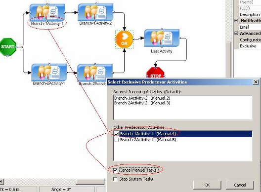 The "Nearest Incoming Activities" group box displays the activities that are nearest the "Or" AgileShape. Selecting the "Cancel Manual Tasks" and/or "Stop System Tasks" will cancel the activity that has yet to complete.