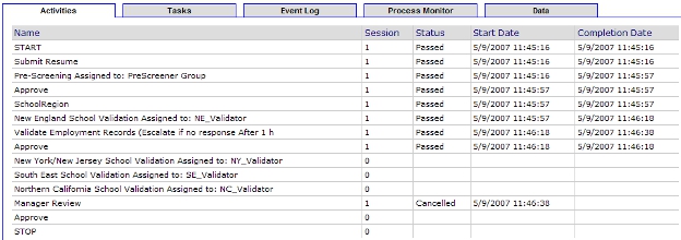 The Activities tab allows the administrator to review detailed information about the activities associated with the process.