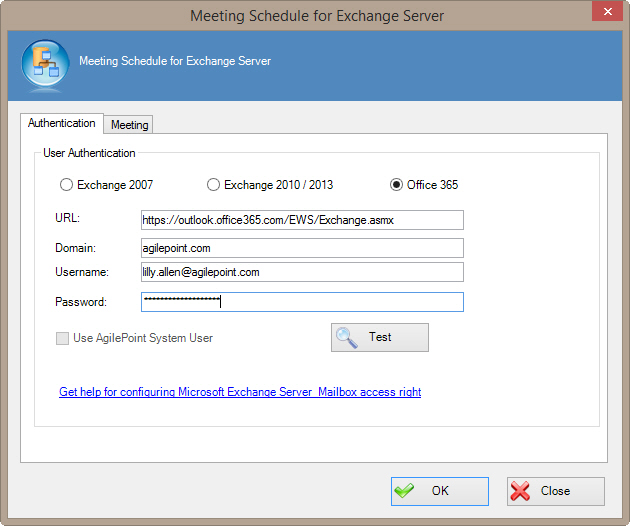 Test button. The Test button is disabled if Use AgilePoint System User is