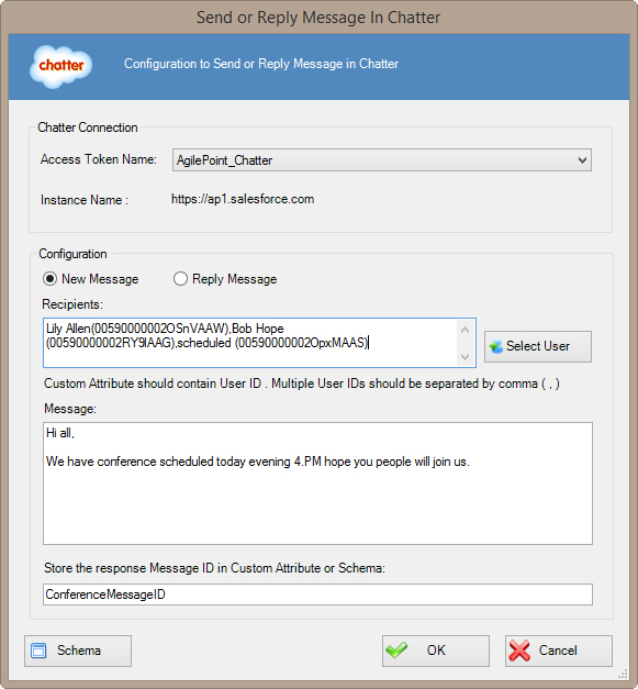 - Reply Message To - Specifies the ID of the Chatter message thread