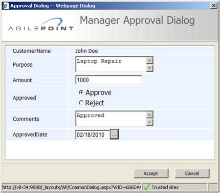 The most common use for this AgileShape is creating simple input or approval forms. Once you have created a Common Dialog and deployed your process, the dialog displays to a user when he or she clicks a task in SharePoint. The following image shows an approval form using a Common Dialog.