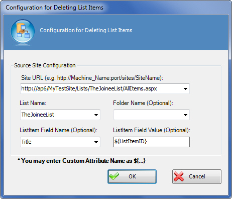 - If ListItem Field Name is set to ID, and ListItem Field Value is set to 5, only the list item with the ID equal to 5 is deleted.