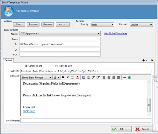 - In one of the following fields, click Add Mail Template.