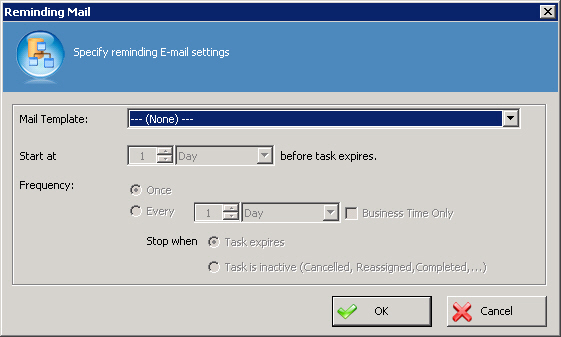 • Every - Specifies the frequency to send repeated reminder emails. You can specify a number of minutes, hours, days, or weeks, whether to use business time and whether to stop sending the reminders after the task expires, or after it is inactive for some other reason.