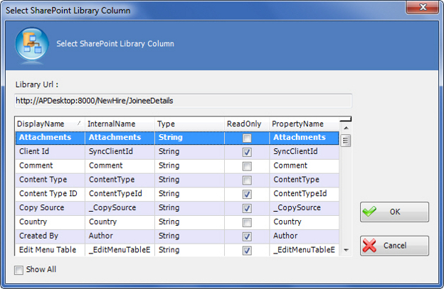Completes the task, and opens the window where this Select SharePoint Library Column window was invoked to specify the metadata field:
