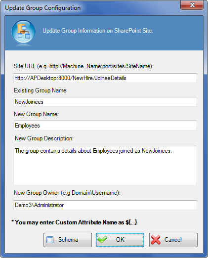- Specifies the name of the SharePoint user you want to be the new owner of your group.