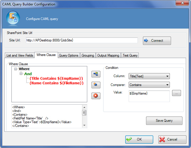 - On the CAML Query Configuration field, click the Ellipses button.