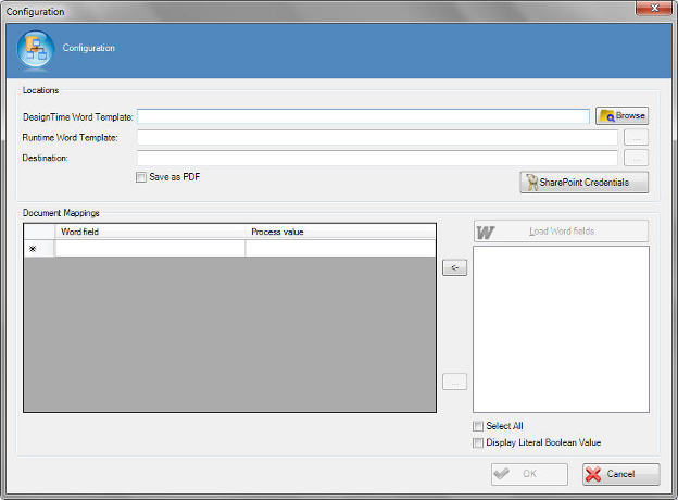 - Specifies the word field that is to be mapped to the process value. The mapping is performed to update the fields in the Word document or PDF document, generated as output.