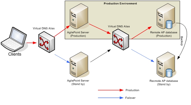 - The virtual DNS alias points to the production AgilePoint Server. (This production