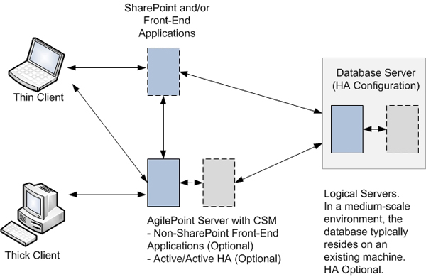 In a small-scale deployment architecture, the front-end application and AgilePoint Server are on one server, and the database server can be shared with other applications if process loading not heavy. However, since AgilePoint is a database-intensive server, a dedicated and faster database server will increase overall AgilePoint performance. (Note that in systems with minimum memory requirements, you may also want a separate machine to run SharePoint.) Small-scale architecture should be considered to be entry-level and departmental small business deployment