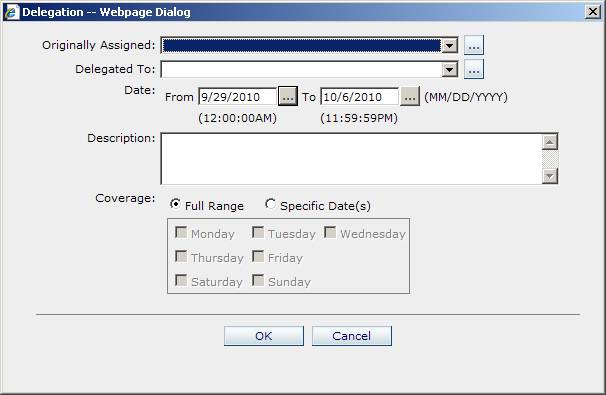 - Select the Full Range option button to enable the delegation for all dates, or the Specific Dates option button and select the dates for which the delegation will take effect.