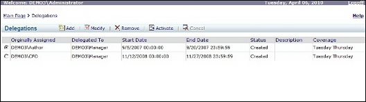 The Delegations page allows the administrator to view and manage delegation rules. Delegation is the temporary reassignment of tasks to another user — usually a peer or subordinate. Delegation can be used, for example, to temporarily reassign a task when a user is out of the office.