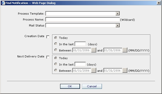 This dialog allows the administrator to search for email notifications by specific criteria.
