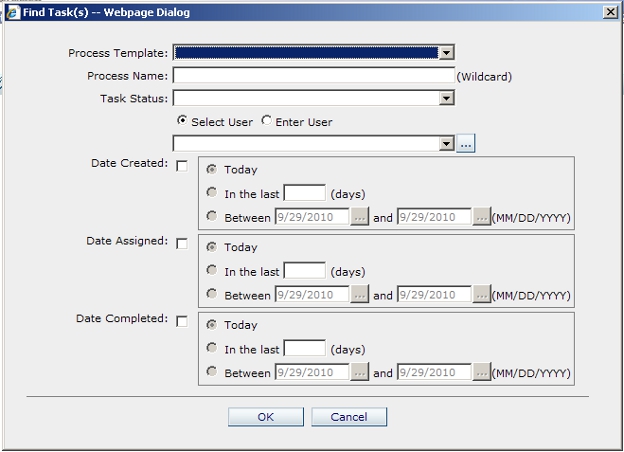 This dialog allows the administrator to search for workflow tasks by specific criteria.