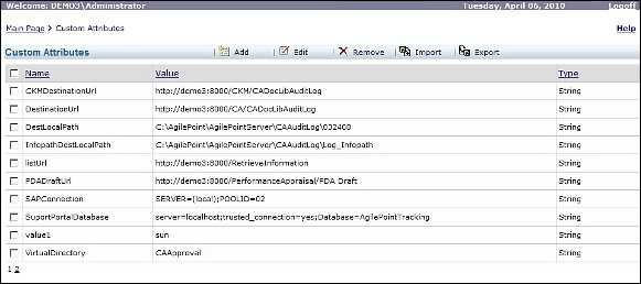 This page allows the administrator to view and configure shared custom process attributes that can be accessed from all processes running on the server (regardless of which process template the process is associated with).