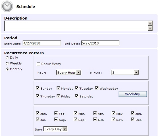 The Hour option indicates an hour of the day on a 24-hour clock, and the Minute option indicates a minute during that hour. Select Every Hour to indicate an event that occurs at a particular minute of every hour (for example, 8:30, 9:30, 10:30, and so on). Select Every Minute to indicate an event that occurs once per minute during a specified hour.
