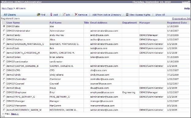 This page allows the administrator to view, search for, and update the user account information that is used by AgilePoint Server.