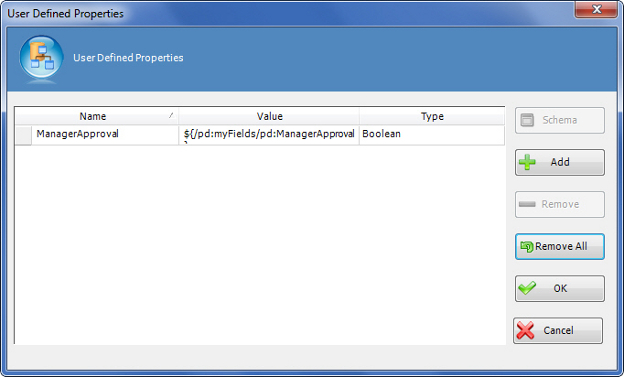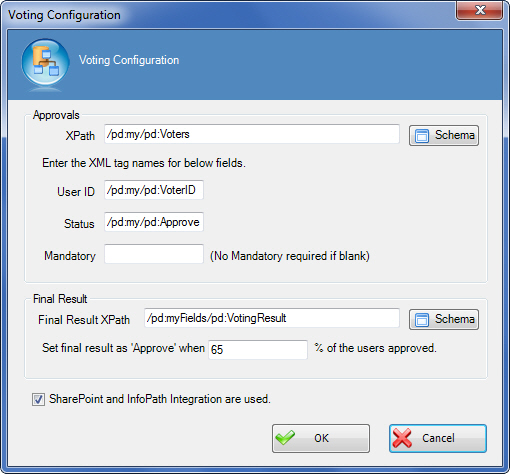 This property allows the process modeler to configure data binding to the data schema within a repeating table for which to establish the approval data. The "Mandatory" option provides an added level of functionality, requiring any participants that have been identified as "Mandatory" to approve, or the final decision will be not-approved. The final result is also configured here by setting a custom attribute to store the final result and specifying the percentage of participants that will need to approve before the final decision is considered as approved. For example, the process designer specifies the voting percentage as 60%. If 60% of the approvers approve the preceding request, then the final decision is considered as approved. Click the Ellipses button to open the configuration dialog. ![]() |