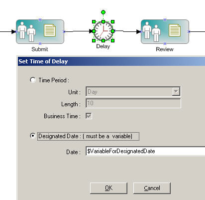 For example in the following screen shot, a Delay activity is added between the Submit and Review activities. You can then configure the Delay activity in Envision to specify either a 'Time Period' or a 'Designated Date'. When a 'Time Period' is specified such as 10 Business days, the Review activity won't start until 10 business days after the completion of the Submit activity.