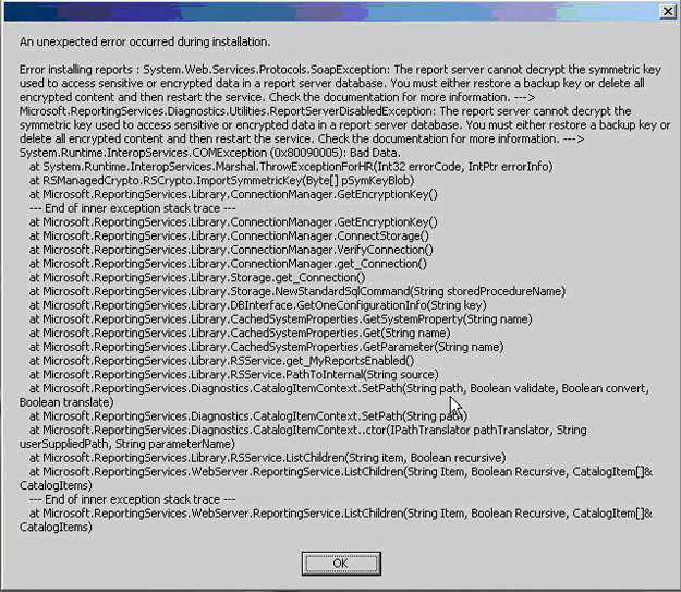 Error installing reports : System.Web.Services.Protocols.SoapException: The report server cannot decrypt the symmetric key used to access sensitive or encrypted data in a report server database. You must either restore a backup key or delete all encrypted content and then restart the service.