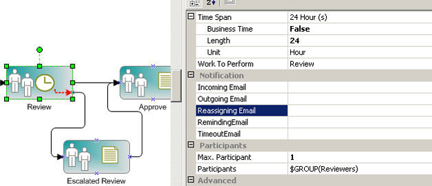 However, if no one claim the task after 24 hours, the Review activity will be timed out and the process will be routed to the Escalated Review activity in which you will assign the same Review (Work To Perform) task or a different Work To Perform task to another person.