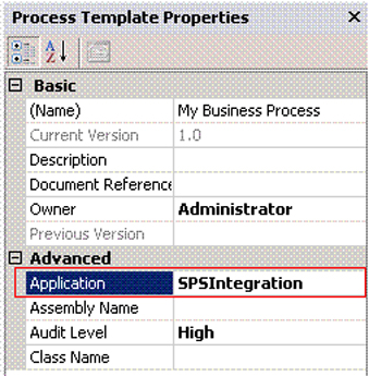 In order to use SharePoint Integration, type SPSIntegration (case sensitive) for the Application property of your process template (see picture below), and then update the process template to AgilePoint Server. The process template should now be displayed in the Set Process Template page drop-down list when you try to set the process template.