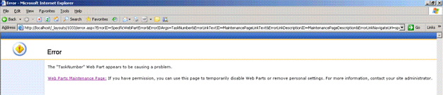 Under such conditions, as soon as the Task List web part is dropped onto a page (e.g. a portal page) and/or whenever a page that uses the web part is loaded in the browser, the browser will automatically redirect to an error page with the text "The TaskNumber Web Part appears to be causing a problem." (as shown above).