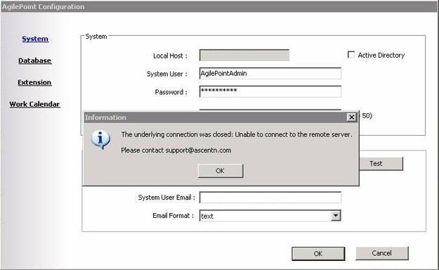 When trying to resolve the above error, the first things to check are whether a firewall (e.g. Windows Personal Firewall) or anti-virus application (e.g. McAfee AntiVirus) is blocking or interfering with web service calls to AgilePoint Server. For example, if a firewall or anti-virus application is configured to prevent web service calls on port 80 (or whatever other port AgilePoint Server uses), then you will need to reconfigure the application that is preventing the calls from succeeding.