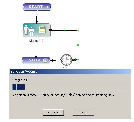 Try to use the Delay AgilePart in the process template but received error during process validation. The error is: "Condition 'Timeout = true' of activity 'Delay' can not have incoming link.