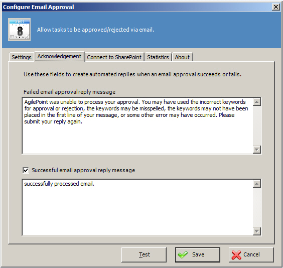 - On the Configure Email Approval window, click the Acknowledgement tab.