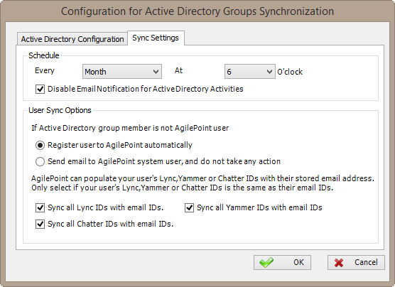 - On the Configuration for Active Directory Groups Synchronization window, click the Sync Settings tab.