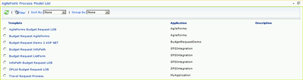 - View Process Model - Displays the process model of the selected process template on a Process Viewer page.