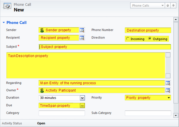 The following is an example of a form created using the Phone Call Activity AgileShape.